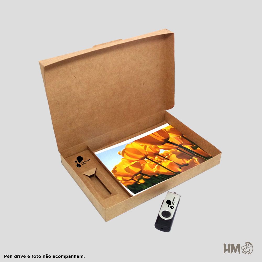 Caixa com capacidade para acondicionar 24 fotos (10 cm x 15 cm) e 1 Pen drive